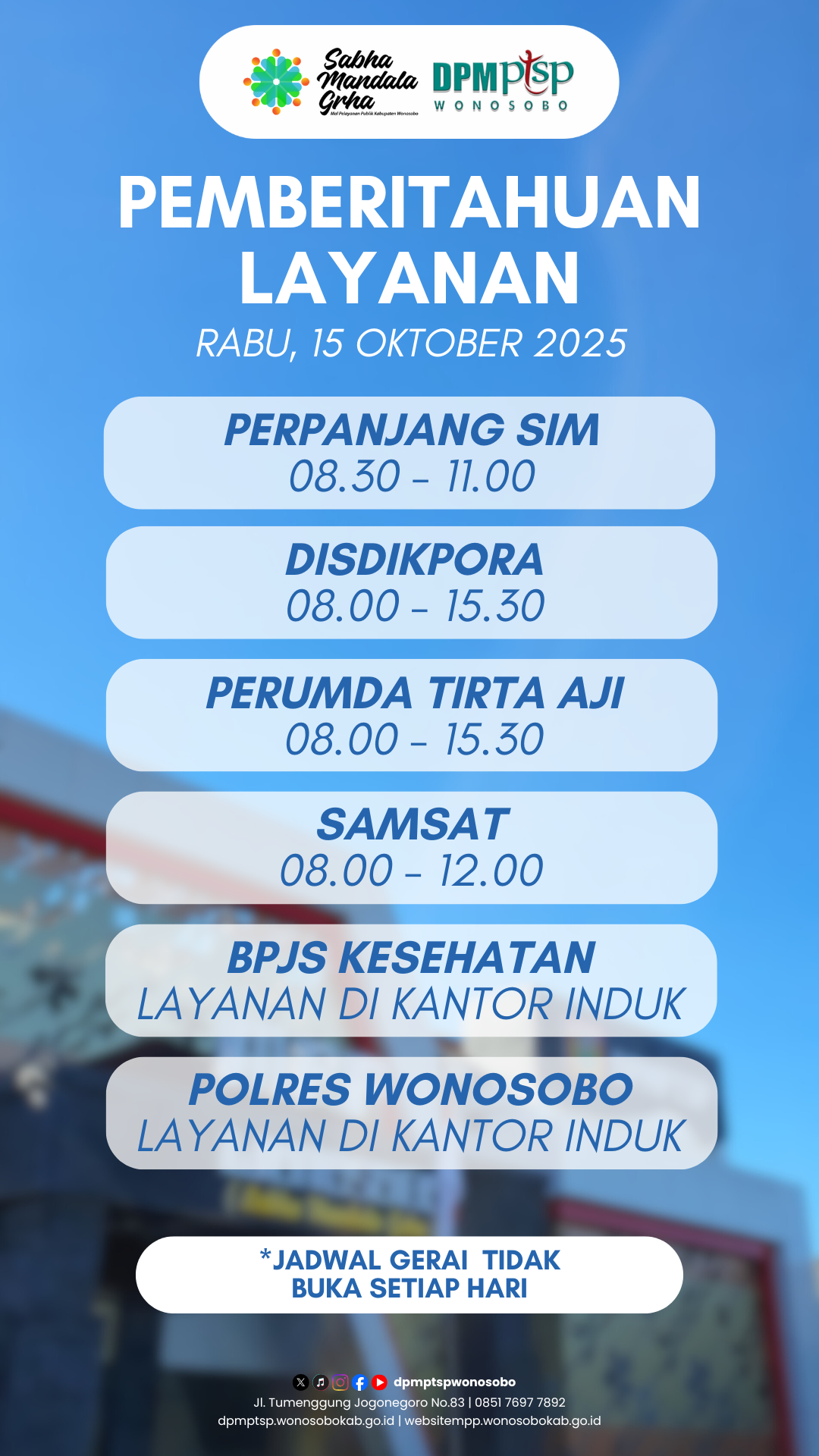 Jam operasional MPP Kabupaten Wonosobo pada Senin-Kamis buka pukul 08.00-15.30, sementara pada Jumat pukul 08.00-10.30. Sabtu, Minggu, Hari Besar, Cuti Bersama Libur